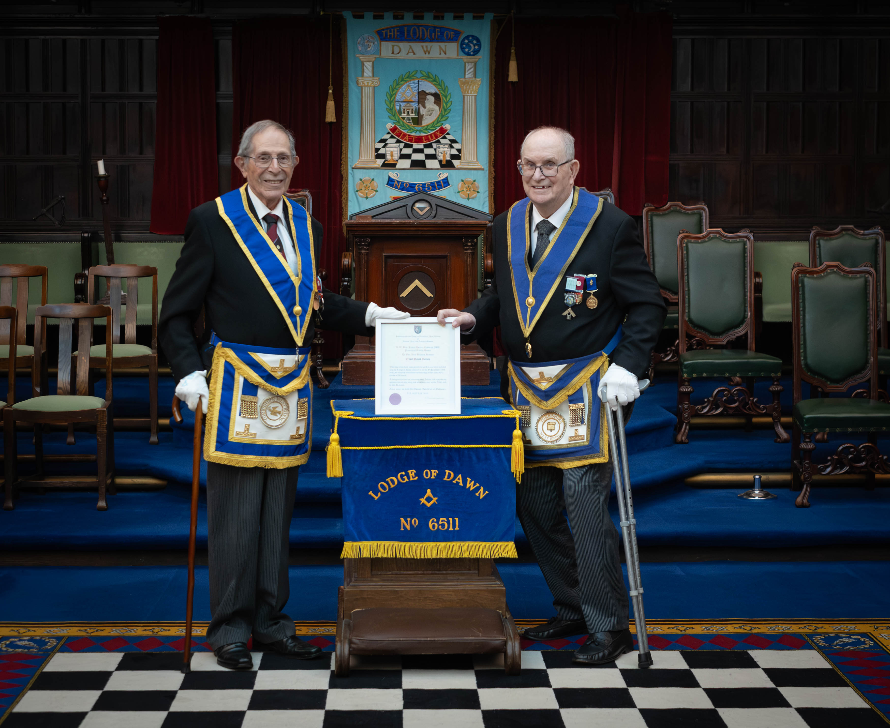 Once initiation was complete we moved along to a very special moment. Worshipful Brother Nevil Tolkin was presented with a certificate to commemorate 50 years since his Initiation into the Lodge of Dawn by Worshipful Brother Geoffrey Caplin.